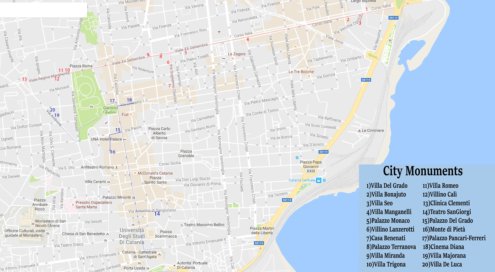 Percorso A: Villa del Grado, Villa Bonajuto, Villa Manganelli, Palazzo Monaco, Villa Miranda, Villino Lanzerotti, Casa Benanti, VIlla Trigona, Villa Romeo, Clinica Clementi